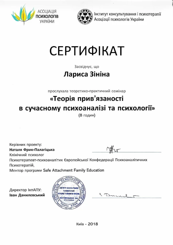 - 2019: Теоретико-практичниий семінар «Теорія прив'язаності в сучасному психоаналізі та психології»