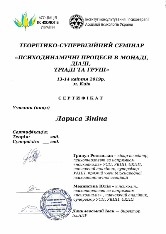 - 2019: Теоретико-практичниий семінар «Психодинамічні процеси в монаді, діаді, тріаді та групі»